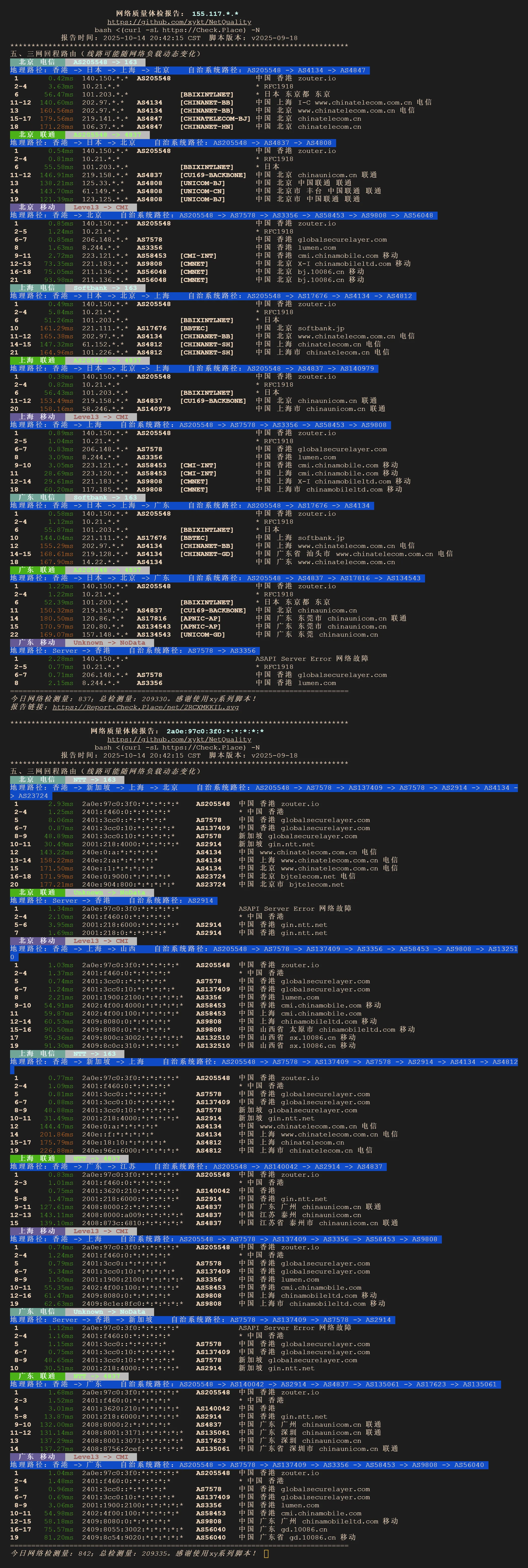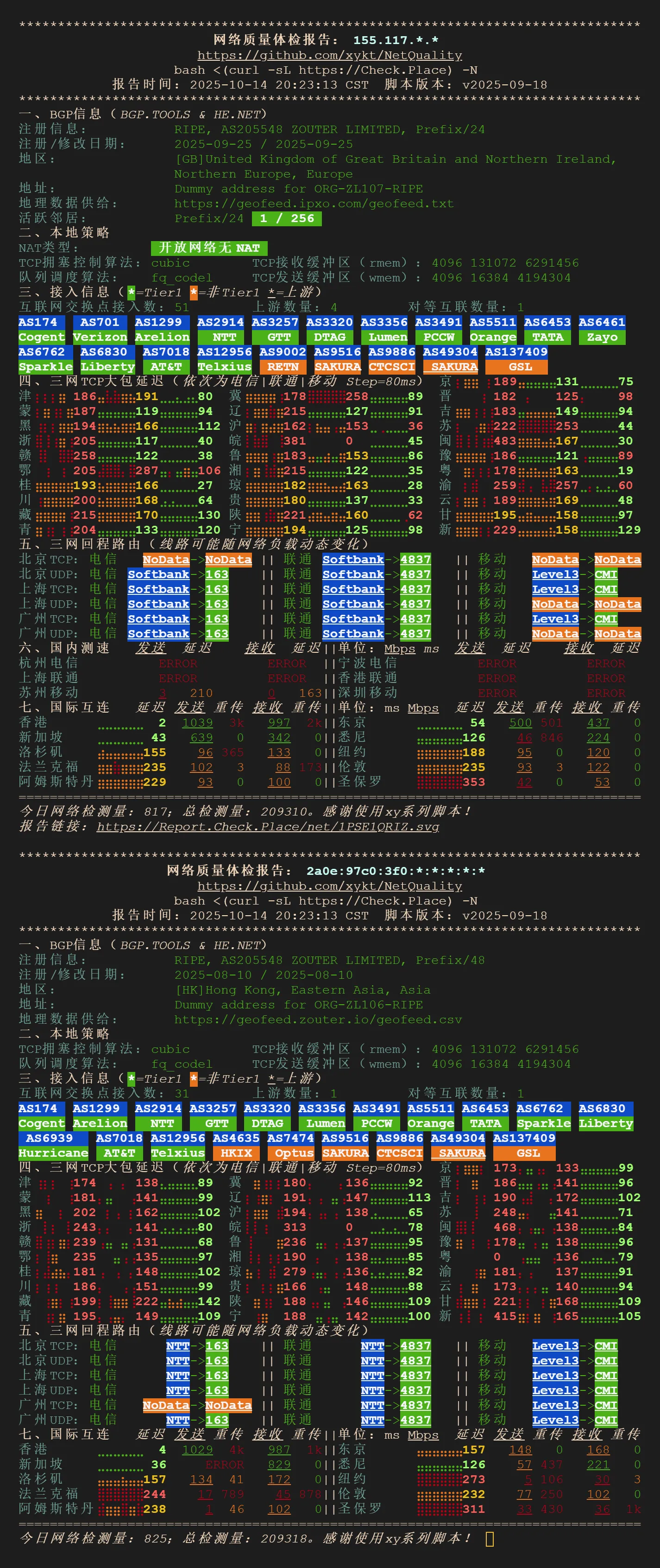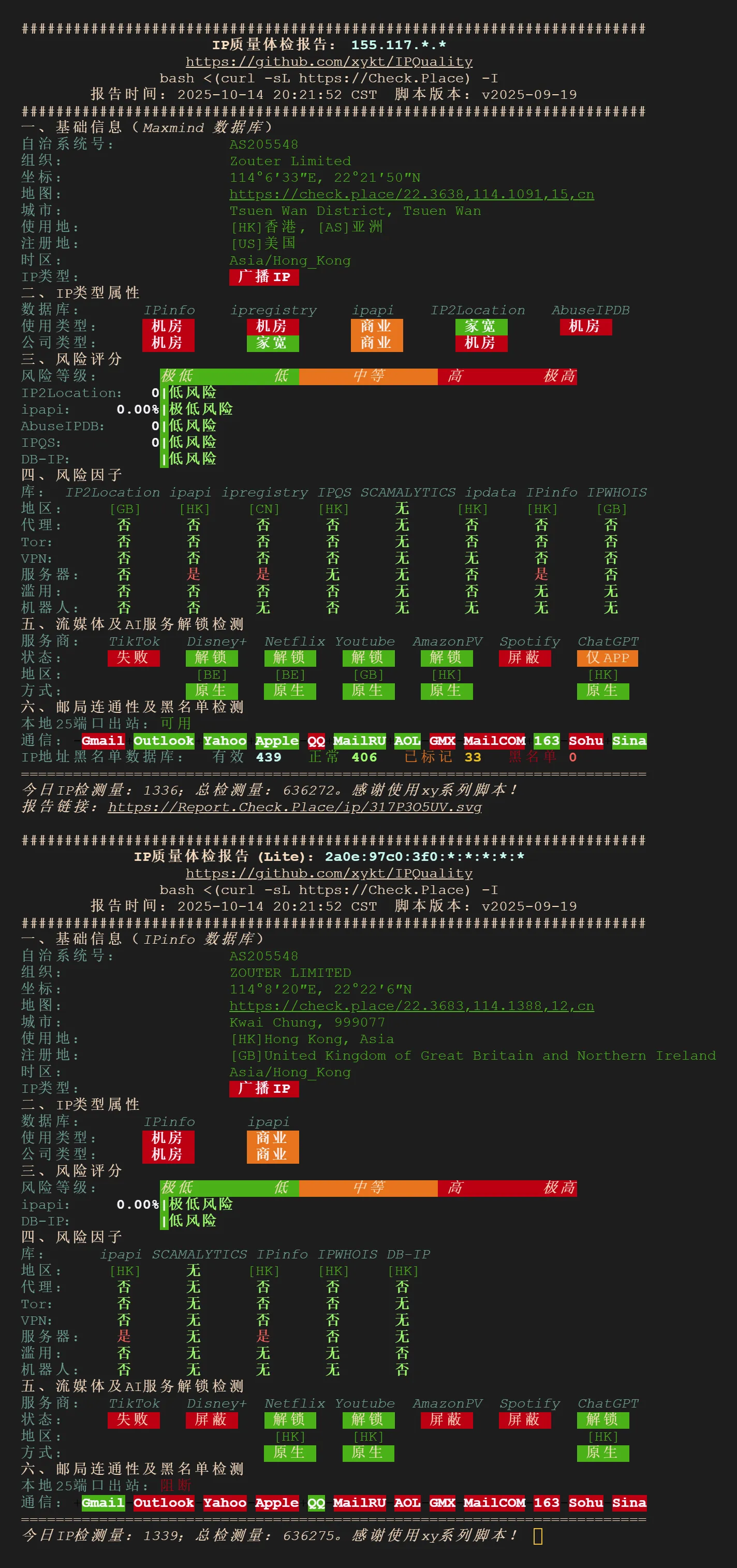 | -------------------------------------VPS融合怪测试------------------------------------- 版本:v0.1.89 测评频道: https: Go项目地址:https: Shell项目地址:https: --------------------------------------系统基础信息-------------------------------------- CPU 型号 : AMD Ryzen 9 9950X 16-Core Processor @ 4291.912 MHz CPU 数量 : 1 Virtual CPU(s) CPU 缓存 : L1: 80 KB / L2: 1 MB / L3: 64 MB AES-NI : ✔️ Enabled VM-x/AMD-V/Hyper-V : ✔️ Enabled 内存 : 236.43 MB / 967.95 MB 气球驱动 : ✔️ Enabled 内核页合并 : ❌ Undetected 虚拟内存 Swap : [ no swap partition or swap file detected ] 硬盘空间 : 959.66 MB / 14.66 GB [6.4%%] /dev/vda1 - / 启动盘路径 : /dev/vda1 系统 : debian 13.1 [x86_64] 内核 : 6.12.43+deb13-cloud-amd64 系统在线时间 : 0 days, 00 hours, 41 minutes 时区 : CST 负载 : 0.86 / 0.42 / 0.47 虚拟化架构 : KVM NAT类型 : Full Cone TCP加速方式 : cubic IPV4 ASN : AS205548 Zouter Limited IPV4 Location : Tsuen Wan / Tsuen Wan District / Hong Kong IPV4 Active IPs : 1/256 (subnet /24) IPV6 ASN : AS205548 Zouter Limited IPV6 Location : Kwai Chung / Kwai Tsing District / Liechtenstein IPv6 子网掩码 : /64 --------------------------------CPU测试-通过sysbench测试-------------------------------- 1 线程测试(单核)得分: 5665.18 ---------------------------------内存测试-通过stream测试---------------------------------- Function Best Rate MB/s Avg time Min time Max time Copy: 20591.9 0.011150 0.007770 0.027502 Scale: 15476.8 0.020972 0.010338 0.060234 Add: 18015.5 0.024153 0.013322 0.073356 Triad: 17615.7 0.016138 0.013624 0.018568 -----------------------------------硬盘测试-通过fio测试----------------------------------- 测试路径 块大小 读测试(IOPS) 写测试(IOPS) 总和(IOPS) /root 4k 72.03 MB/s(18.0k) 72.22 MB/s(18.1k) 144.25 MB/s(36.1k) /root 64k 1.21 GB/s(18.9k) 1.21 GB/s(19.0k) 2.42 GB/s(37.8k) /root 512k 1.25 GB/s(2432) 1.31 GB/s(2562) 2.56 GB/s(4994) /root 1m 1.22 GB/s(1192) 1.30 GB/s(1271) 2.52 GB/s(2463) -------------------------------------御三家流媒体解锁------------------------------------- ----------------Netflix----------------- [IPV4] 您的出口IP完整解锁Netflix,支持非自制剧的观看 NF所识别的IP地域信息:比利时 [IPV6] 您的出口IP完整解锁Netflix,支持非自制剧的观看 NF所识别的IP地域信息:中国香港 ----------------Youtube----------------- [IPV4] 连接方式: Youtube Video Server 视频缓存节点地域: 中国香港(HKG33S01) [IPV6] 连接方式: Youtube Video Server 视频缓存节点地域: 中国香港(HKG33S01) Youtube识别地域: 中国香港(HK) ---------------DisneyPlus--------------- [IPV4] 当前IPv4出口所在地区即将开通DisneyPlus [IPV6] 当前IPv4出口所在地区即将开通DisneyPlus -------------------------------------跨国流媒体解锁-------------------------------------- IPV4: ============[ 跨国平台 ]============ Apple YES (Region: HKG) BingSearch YES (Region: HK) Claude YES Dazn YES (Region: HK) Disney+ YES (Region: BE) Gemini NO GoogleSearch YES Google Play Store YES (Region: GB) IQiYi YES (Region: HK) Instagram Licensed Audio YES KOCOWA NO MetaAI Unknown: get www.meta.ai failed with code: 200 Netflix YES (Region: US) Netflix CDN HK OneTrust YES (Region: HK) ChatGPT YES (Only Available with Mobile APP) Paramount+ YES Amazon Prime Video YES (Region: HK) Reddit YES SonyLiv YES (Region: IN) Sora Banned (VPN Blocked) Spotify Registration NO Steam Store YES (Community Available) (Region: HK) TVBAnywhere+ YES (Region: HK) TikTok NO Viu.com YES Wikipedia Editability YES YouTube Region YES (Region: GB) YouTube CDN HKG --------------------------------------IP质量检测-------------------------------------- 以下为各数据库编号,输出结果后将自带数据库来源对应的编号 ipinfo数据库 [0] | scamalytics数据库 [1] | virustotal数据库 [2] | abuseipdb数据库 [3] | ip2location数据库 [4] ip-api数据库 [5] | ipwhois数据库 [6] | ipregistry数据库 [7] | ipdata数据库 [8] | db-ip数据库 [9] ipapiis数据库 [A] | ipapicom数据库 [B] | bigdatacloud数据库 [C] | dkly数据库 [D] | ipqualityscore数据库 [E] IPV4: 安全得分: 声誉(越高越好): 0 [2] 信任得分(越高越好): 2 [8] VPN得分(越低越好): 94 [8] 代理得分(越低越好): 100 [8] 社区投票-无害: 0 [2] 社区投票-恶意: 0 [2] 威胁得分(越低越好): 100 [8] 欺诈得分(越低越好): 0 [E] 滥用得分(越低越好): 0 [3] ASN滥用得分(越低越好): 0.0003 (Very Low) [A] 公司滥用得分(越低越好): 0 (Very Low) [A] 威胁级别: low [9] 黑名单记录统计:(有多少黑名单网站有记录): 无害记录数: 0 [2] 恶意记录数: 0 [2] 可疑记录数: 0 [2] 无记录数: 95 [2] 安全信息: 使用类型: corporate [9] hosting [0 7] DataCenter/WebHosting/Transit [3] hosting ASN [C] business [8 A] 公司类型: business [A] hosting [0] isp [7] 是否云提供商: Yes [7 D] 是否数据中心: Yes [0 A C] No [5 6 8] 是否移动设备: Yes [E] No [5 A C] 是否代理: No [0 4 5 6 7 8 9 A C D E] 是否VPN: No [0 6 7 A C D E] 是否TorExit: No [7 D] 是否Tor出口: No [7 D] 是否网络爬虫: No [9 A E] 是否匿名: No [6 7 8 D] 是否攻击者: No [7 8 D] 是否滥用者: No [7 8 A C D E] 是否威胁: No [7 8 C D] 是否中继: No [0 7 8 C D] 是否Bogon: No [7 8 A C D] 是否机器人: No [E] DNS-黑名单: 315(Total_Check) 0(Clean) 5(Blacklisted) 24(Other) IPV6: 安全得分: 滥用得分(越低越好): 0 [3] ASN滥用得分(越低越好): 0.0003 (Very Low) [A] 公司滥用得分(越低越好): 0 (Very Low) [A] 安全信息: 使用类型: DataCenter/WebHosting/Transit [3] business [A] 公司类型: business [A] 是否数据中心: Yes [A] 是否移动设备: No [A] 是否代理: No [A] 是否VPN: No [A] 是否Tor: No [3 A] 是否网络爬虫: No [A] 是否滥用者: No [A] 是否Bogon: No [A] DNS-黑名单: 315(Total_Check) 0(Clean) 0(Blacklisted) 3
