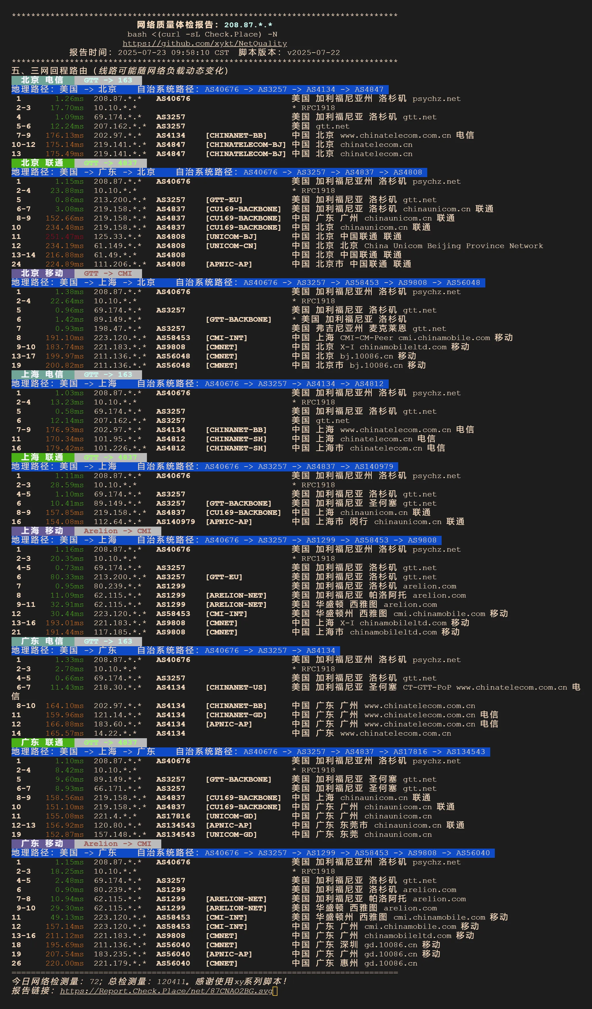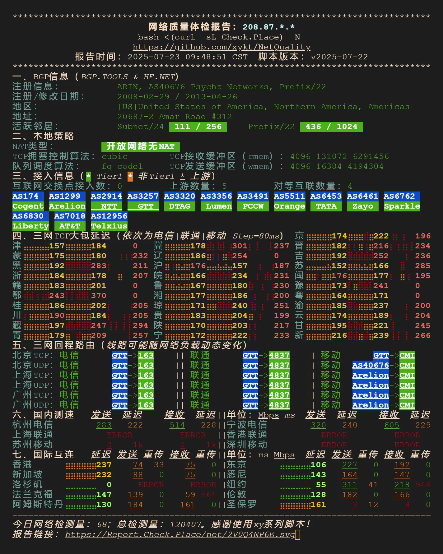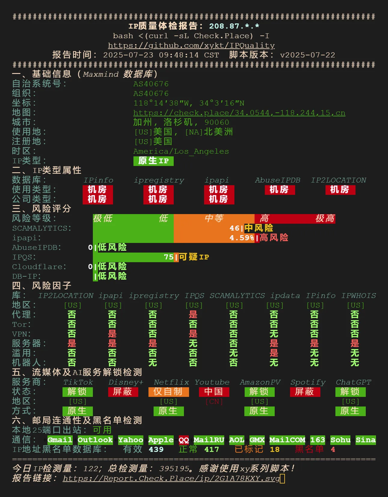| -------------------------------------VPS融合怪测试------------------------------------- 版本:v0.1.67 测评频道: https: Go项目地址:https: Shell项目地址:https: --------------------------------------系统基础信息-------------------------------------- CPU 型号 : Intel(R) Xeon(R) CPU E3-1230 V2 @ 3.30GHz CPU 数量 : 8 Physical CPU(s) CPU 缓存 : L1: 256 KB / L2: 1 MB / L3: 8 MB GPU 型号 : MGA G200eW WPCM450 AES-NI : ✔️ Enabled VM-x/AMD-V/Hyper-V : ✔️ Enabled 内存 : 898.54 MB / 15.59 GB 气球驱动 : ❌ Undetected 内核页合并 : ❌ Undetected 虚拟内存 Swap : [ no swap partition or swap file detected ] 硬盘空间 Disk 1 : 0.03 MB / 915.82 GB [0.0%%] /dev/sdb1 - /opt/disk 硬盘空间 Disk 2 : 8.43 GB / 230.86 GB [3.6%%] /dev/sda6 - / 启动盘路径 : /dev/sda6 系统 : debian 12.11 [x86_64] 内核 : 6.1.0-37-amd64 系统在线时间 : 0 days, 00 hours, 43 minutes 时区 : PDT 负载 : 0.03 / 0.31 / 0.39 虚拟化架构 : Dedicated (No visible signage) TCP加速方式 : cubic IPV4 ASN : AS40676 AS40676 IPV4 Location : Los Angeles / California / United States IPV4 Active IPs : 111/256 (subnet /24) 436/1024 (prefix /22) --------------------------------CPU测试-通过sysbench测试-------------------------------- 1 线程测试(单核)得分: 1035.46 8 线程测试(多核)得分: 6530.01 --------------------------------内存测试-通过sysbench测试--------------------------------- 单线程顺序写速度: 19370.39 MB/s(20.31K IOPS, 5s) 单线程顺序读速度: 22829.39 MB/s(23.94K IOPS, 5s) -----------------------------------硬盘测试-通过fio测试----------------------------------- 测试路径 块大小 读测试(IOPS) 写测试(IOPS) 总和(IOPS) /root 4k 101.78 MB/s(25.4k) 102.05 MB/s(25.5k) 203.83 MB/s(51.0k) /root 64k 133.79 MB/s(2090) 134.49 MB/s(2101) 268.28 MB/s(4191) /root 512k 133.25 MB/s(260) 140.33 MB/s(274) 273.58 MB/s(534) /root 1m 132.59 MB/s(129) 141.42 MB/s(138) 274.01 MB/s(267) -------------------------------------御三家流媒体解锁------------------------------------- ----------------Netflix----------------- [IPV4] 您的出口IP完整解锁Netflix,支持非自制剧的观看 NF所识别的IP地域信息:美国 [IPV6] 您的网络可能没有正常配置IPv6,或者没有IPv6网络接入 ----------------Youtube----------------- [IPV4] 连接方式: Youtube Video Server 视频缓存节点地域: 美国 洛杉机(LAX31S13) [IPV6] Youtube在您的出口IP所在的国家不提供服务 ---------------DisneyPlus--------------- [IPV4] 当前IPv4出口所在地区即将开通DisneyPlus [IPV6] DisneyPlus在您的出口IP所在的国家不提供服务 -------------------------------------跨国流媒体解锁-------------------------------------- IPV4: ============[ 跨国平台 ]============ Apple YES (Region: USA) BingSearch YES (Region: US) Claude YES Dazn Banned Disney+ NO (forbidden-location) Gemini NO GoogleSearch YES Google Play Store NO (Region: CN) IQiYi YES (Region: US) Instagram Licensed Audio YES KOCOWA YES MetaAI YES (Region: US) Netflix YES (Region: US) Netflix CDN US OneTrust YES (Region: US CALIFORNIA) ChatGPT YES (Region: US) Paramount+ YES Amazon Prime Video YES (Region: US) Reddit NO SonyLiv YES (Region: US) Sora YES (Region: US) Spotify Registration NO Steam Store YES (Community Available) (Region: US) TVBAnywhere+ YES (Region: US) TikTok YES (Region: US) Viu.com YES Wikipedia Editability NO YouTube Region NO YouTube CDN LAX --------------------------------------IP质量检测-------------------------------------- 以下为各数据库编号,输出结果后将自带数据库来源对应的编号 ipinfo数据库 [0] | scamalytics数据库 [1] | virustotal数据库 [2] | abuseipdb数据库 [3] | ip2location数据库 [4] ip-api数据库 [5] | ipwhois数据库 [6] | ipregistry数据库 [7] | ipdata数据库 [8] | db-ip数据库 [9] ipapiis数据库 [A] | ipapicom数据库 [B] | bigdatacloud数据库 [C] | dkly数据库 [D] | ipqualityscore数据库 [E] IPV4: 安全得分: 声誉(越高越好): 0 [2] 信任得分(越高越好): 0 [8] VPN得分(越低越好): 100 [8] 代理得分(越低越好): 100 [8] 社区投票-无害: 0 [2] 社区投票-恶意: 0 [2] 威胁得分(越低越好): 100 [8] 欺诈得分(越低越好): 65 [E] 46 [1] 滥用得分(越低越好): 0 [3] ASN滥用得分(越低越好): 0.0016 (Low) [A] 公司滥用得分(越低越好): 0.0459 (High) [A] 威胁级别: low [9] 黑名单记录统计:(有多少黑名单网站有记录): 无害记录数: 60 [2] 恶意记录数: 1 [2] 可疑记录数: 0 [2] 无记录数: 33 [2] 安全信息: 使用类型: hosting - high probability [C] hosting [0 7 8 9 A] DataCenter/WebHosting/Transit [3] 公司类型: hosting [0 A] isp [7] 是否云提供商: Yes [7] 是否数据中心: No [C] Yes [0 1 5 6 8 A] 是否移动设备: Yes [E] No [5 A C] 是否代理: No [0 1 4 5 6 7 8 9 A C] Yes [E] 是否VPN: No [0 1 6 7 C] Yes [A E] 是否Tor: No [0 1 3 6 7 8 A C E] 是否Tor出口: No [1 7] 是否网络爬虫: No [9 A E] 是否匿名: No [1 6 7 8] 是否攻击者: No [7] Yes [8] 是否滥用者: No [7 A C E] Yes [8] 是否威胁: Yes [8] No [7 C] 是否中继: No [0 7 8 C] 是否Bogon: No [7 8 A C] 是否机器人: No [E] DNS-黑名单: 314(Total_Check) 0(Clean) 9(Blacklisted) 17(Other) --------------------------------------邮件端口检测-------------------------------------- Platform SMTP SMTPS POP3 POP3S IMAP IMAPS LocalPort ✔ ✔ ✔ ✔ ✔ ✔ QQ ✔ ✔ ✔ ✘ ✔ ✘ 163 ✔ ✔ ✔ ✘ ✔ ✘ Sohu ✔ ✔ ✔ ✘ ✔ ✘ Yandex ✔ ✔ ✔ ✘ ✔ ✘ Gmail ✔ ✔ ✘ ✘ ✘ ✘ Outlook ✔ ✘ ✔ ✘ ✔ ✘ Office365 ✔ ✘ ✔ ✘ ✔ ✘ Yahoo ✔ ✔ ✘ ✘ ✘ ✘ MailCOM ✔ ✔ ✔ ✘ ✔ ✘ MailRU ✔ ✔ ✘ ✘ ✔ ✘ AOL ✔ ✔ ✘ ✘ ✘ ✘ GMX ✔ ✔ ✔ ✘ ✔ ✘ Sina ✔ ✔ ✔ ✘ ✔ ✘ Apple ✘ ✔ ✘ ✘ ✘ ✘ FastMail ✘ ✔ ✘ ✘ ✘ ✘ ProtonMail✘ ✘ ✘ ✘ ✘ ✘ MXRoute ✔ ✘ ✔ ✘ ✔ ✘ Name