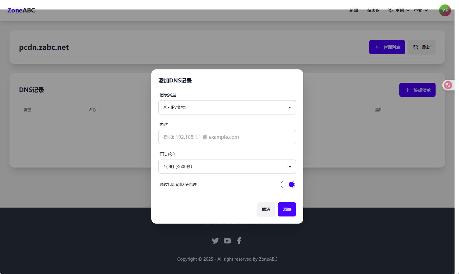 注册完成账号后 点击域名管理 添加解析记录即可