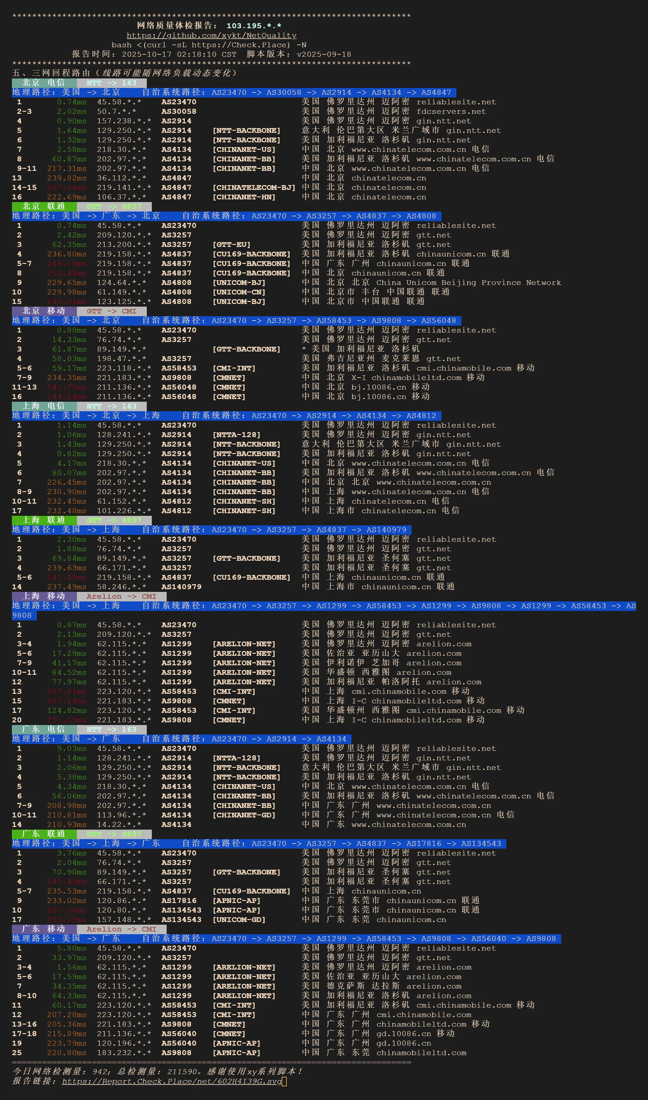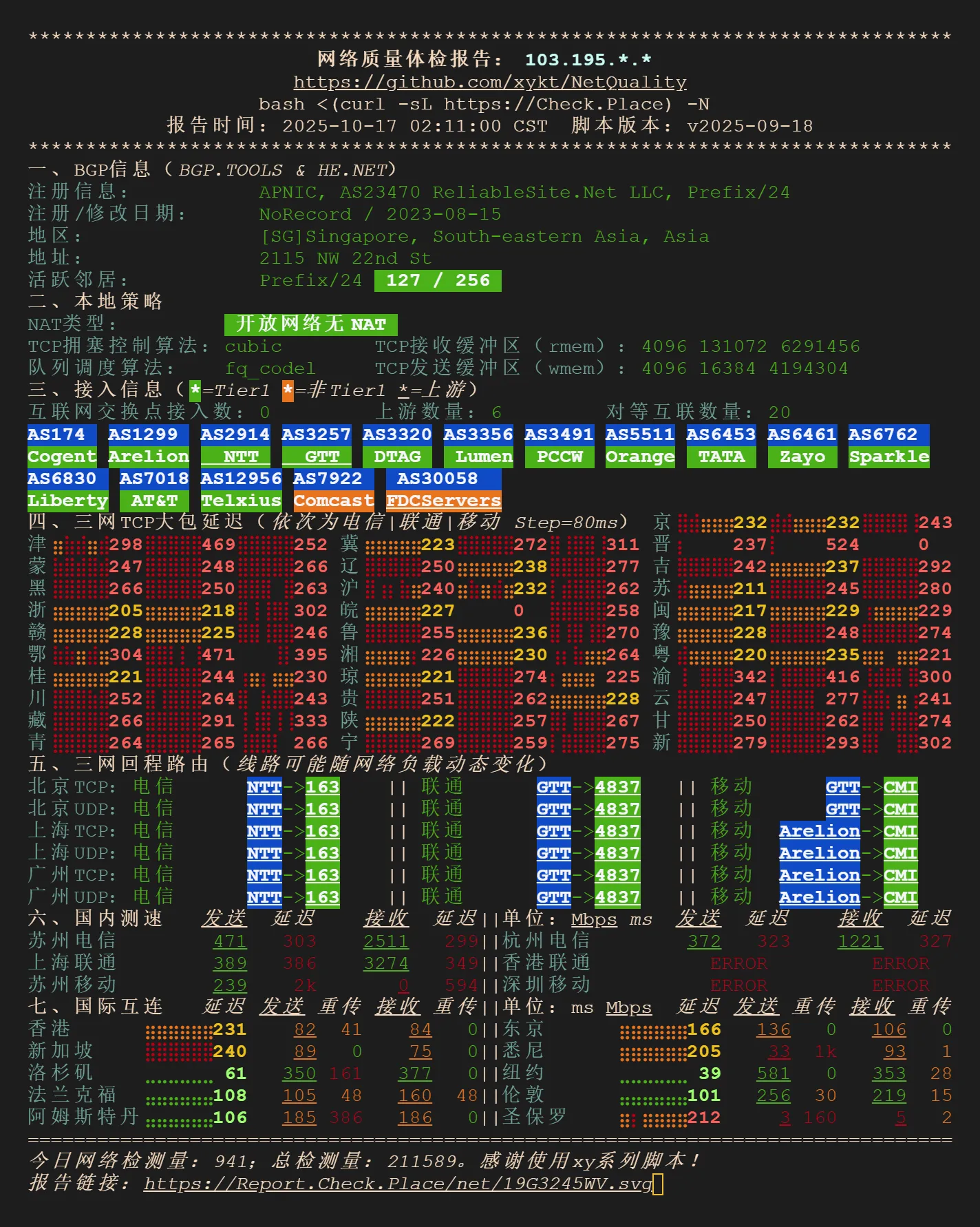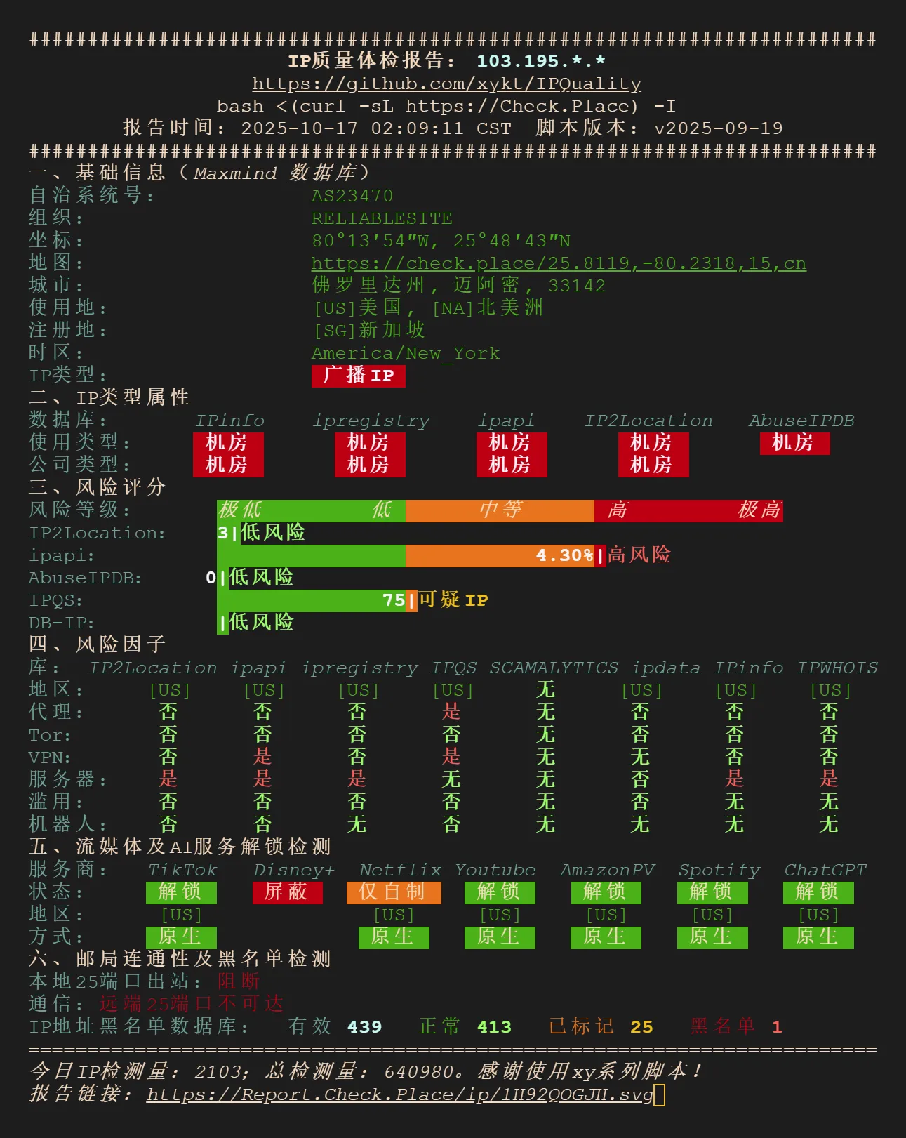 | -------------------------------------VPS融合怪测试------------------------------------- 版本:v0.1.89 测评频道: https: Go项目地址:https: Shell项目地址:https: --------------------------------------系统基础信息-------------------------------------- CPU 型号 : Intel(R) Core(TM) i9-9900K CPU @ 3.60GHz CPU 数量 : 2 Virtual CPU(s) CPU 缓存 : L1: 64 KB / L2: 256 KB / L3: 16 MB GPU 型号 : GD 5446 AES-NI : ✔️ Enabled VM-x/AMD-V/Hyper-V : ✔️ Enabled 内存 : 372.76 MB / 3.82 GB 气球驱动 : ✔️ Enabled 内核页合并 : ❌ Undetected 虚拟内存 Swap : 0.00 MB / 1023.98 MB 硬盘空间 : 1.51 GB / 48.12 GB [3.1%%] /dev/vda1 - / 启动盘路径 : /dev/vda1 系统 : debian 12.9 [x86_64] 内核 : 6.1.0-31-amd64 系统在线时间 : 0 days, 00 hours, 21 minutes 时区 : UTC 负载 : 0.08 / 0.15 / 0.23 虚拟化架构 : KVM NAT类型 : Full Cone TCP加速方式 : cubic IPV4 ASN : AS23470 RELIABLESITE IPV4 Location : Miami / Florida / United States IPV4 Active IPs : 127/256 (subnet /24) --------------------------------CPU测试-通过sysbench测试-------------------------------- 1 线程测试(单核)得分: 1337.16 2 线程测试(多核)得分: 2634.65 ---------------------------------内存测试-通过stream测试---------------------------------- Function Best Rate MB/s Avg time Min time Max time Copy: 33291.4 0.004911 0.004806 0.005061 Scale: 21344.4 0.007611 0.007496 0.007819 Add: 24387.9 0.010010 0.009841 0.010457 Triad: 24598.2 0.009949 0.009757 0.010257 -----------------------------------硬盘测试-通过fio测试----------------------------------- 测试路径 块大小 读测试(IOPS) 写测试(IOPS) 总和(IOPS) /root 4k 261.96 MB/s(65.5k) 262.65 MB/s(65.7k) 524.62 MB/s(131.2k) /root 64k 474.94 MB/s(7420) 477.44 MB/s(7460) 952.38 MB/s(14.9k) /root 512k 630.13 MB/s(1230) 663.61 MB/s(1296) 1.29 GB/s(2526) /root 1m 967.38 MB/s(944) 1.03 GB/s(1007) 2.00 GB/s(1951) -------------------------------------御三家流媒体解锁------------------------------------- ----------------Netflix----------------- [IPV4] 您的出口IP完整解锁Netflix,支持非自制剧的观看 NF所识别的IP地域信息:美国 [IPV6] 您的网络可能没有正常配置IPv6,或者没有IPv6网络接入 ----------------Youtube----------------- [IPV4] 连接方式: Youtube Video Server 视频缓存节点地域: 美国 迈阿密(MIA07S69) [IPV6] Youtube在您的出口IP所在的国家不提供服务 ---------------DisneyPlus--------------- [IPV4] 当前IPv4出口所在地区即将开通DisneyPlus [IPV6] DisneyPlus在您的出口IP所在的国家不提供服务 -------------------------------------跨国流媒体解锁-------------------------------------- IPV4: ============[ 跨国平台 ]============ Apple YES (Region: USA) BingSearch YES (Region: US) Claude YES Dazn Banned Disney+ NO (forbidden-location) Gemini YES (Region: US) GoogleSearch YES Google Play Store YES (Region: US) IQiYi YES (Region: US) Instagram Licensed Audio YES KOCOWA YES MetaAI NO (GeoBlocked) Netflix YES (Region: US) Netflix CDN US OneTrust YES (Region: US FLORIDA) ChatGPT YES (Region: US) Paramount+ Unknown: get www.paramountplus.com failed with code: 406 Amazon Prime Video YES (Region: US) Reddit NO SonyLiv YES (Region: IN) Sora YES (Region: US) Spotify Registration YES (Region: US) Steam Store YES (Community Available) (Region: US) TVBAnywhere+ YES (Region: US) TikTok YES (Region: US) Viu.com YES Wikipedia Editability YES YouTube Region YES (Region: US) YouTube CDN MIA --------------------------------------IP质量检测-------------------------------------- 以下为各数据库编号,输出结果后将自带数据库来源对应的编号 ipinfo数据库 [0] | scamalytics数据库 [1] | virustotal数据库 [2] | abuseipdb数据库 [3] | ip2location数据库 [4] ip-api数据库 [5] | ipwhois数据库 [6] | ipregistry数据库 [7] | ipdata数据库 [8] | db-ip数据库 [9] ipapiis数据库 [A] | ipapicom数据库 [B] | bigdatacloud数据库 [C] | dkly数据库 [D] | ipqualityscore数据库 [E] IPV4: 安全得分: 声誉(越高越好): 0 [2] 信任得分(越高越好): 29 [8] VPN得分(越低越好): 12 [8] 代理得分(越低越好): 100 [8] 社区投票-无害: 0 [2] 社区投票-恶意: 0 [2] 威胁得分(越低越好): 100 [8] 欺诈得分(越低越好): 65 [E] 滥用得分(越低越好): 0 [3] ASN滥用得分(越低越好): 0.0077 (Low) [A] 公司滥用得分(越低越好): 0.043 (High) [A] 威胁级别: low [9] 黑名单记录统计:(有多少黑名单网站有记录): 无害记录数: 61 [2] 恶意记录数: 1 [2] 可疑记录数: 0 [2] 无记录数: 33 [2] 安全信息: 使用类型: corporate [9] hosting - high probability [C] business [8] hosting [0 7 A] DataCenter/WebHosting/Transit [3] 公司类型: hosting [0 7 A] 是否云提供商: Yes [7 D] 是否数据中心: No [8] Yes [0 5 6 A C] 是否移动设备: Yes [E] No [5 A C] 是否代理: Yes [E] No [0 4 5 6 7 8 9 A C D] 是否VPN: Yes [A E] No [0 6 7 C D] 是否Tor: No [0 3 6 7 8 A C D E] 是否Tor出口: No [7 D] 是否网络爬虫: No [9 A E] 是否匿名: No [6 7 8 D] 是否攻击者: No [7 8 D] 是否滥用者: No [7 8 A C D E] 是否威胁: No [7 8 C D] 是否中继: No [0 7 8 C D] 是否Bogon: No [7 8 A C D] 是否机器人: No [E] DNS-黑名单: 315(Total_Check) 0(Clean) 7(Blacklisted) 168(Other) --------------------------------------邮件端口检测-------------------------------------- Platform SMTP SMTPS POP3 POP3S IMAP IMAPS LocalPort ✔ ✔ ✔ ✔ ✔ ✔ QQ ✘ ✔ ✔ ✘ ✔ ✘ 163 ✘ ✔ ✔ ✘ ✔ ✘ Sohu ✘ ✔ ✔ ✘ ✔ ✘ Yandex ✘ ✔ ✔ ✘ ✔ ✘ Gmail ✘ ✔ ✘ ✘ ✘ ✘ Outlook ✘ ✘ ✔ ✘ ✔ ✘ Office365 ✘ ✘ ✔ ✘ ✔ ✘ Yahoo ✘ ✔ ✘ ✘ ✘ ✘ MailCOM ✘ ✔ ✔ ✘ ✔ ✘ MailRU ✘ ✔ ✘ ✘ ✔ ✘ AOL ✘ ✔ ✘ ✘ ✘ ✘ GMX ✘ ✔ ✔ ✘ ✔ ✘ Sina ✘ ✘ ✔ ✘ ✔ ✘ Apple ✘ ✔ ✘ ✘ ✘ ✘ FastMail ✘ ✔ ✘ ✘ ✘ ✘ ProtonMail✘ ✘ 